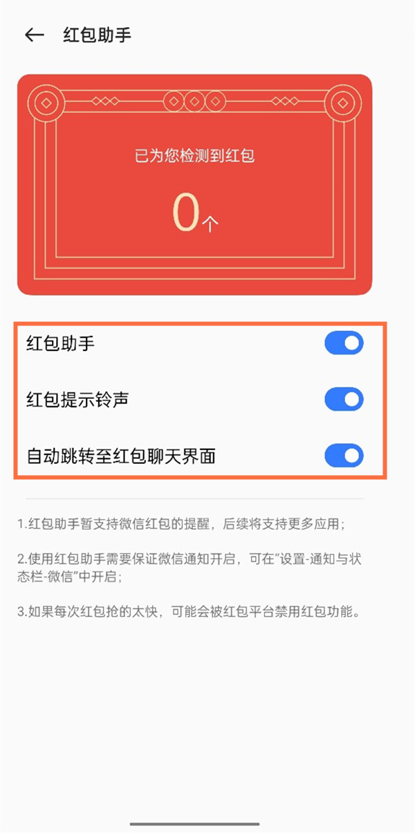 2、将红包助手、红包提示铃声和自动跳转至红包聊天界面的开关开启即可。