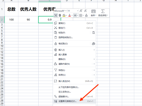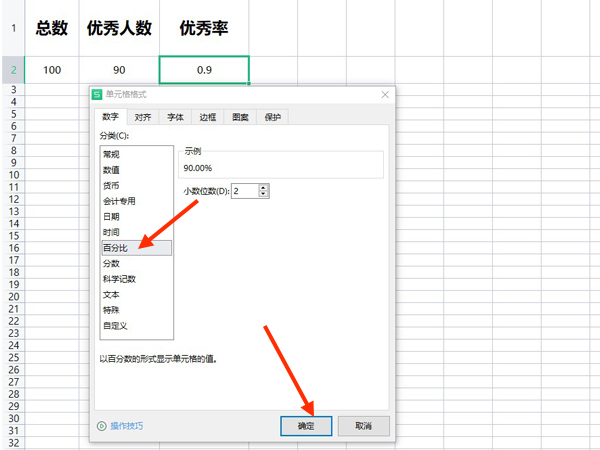 2、右键单击结果单元格,选择设置单元格格式,点击百分比,设置小数位数点确定。