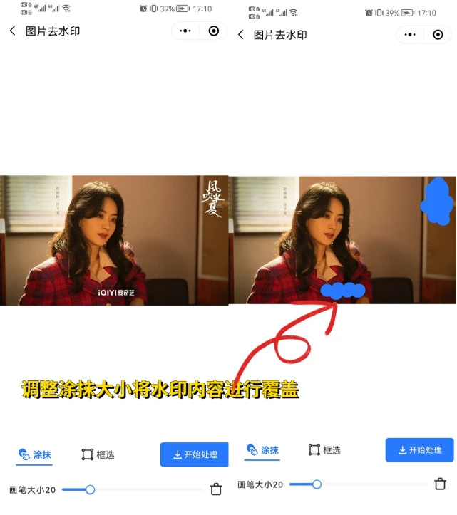 第二步:选择【图片去水印】,然后直接将图片导入进去。选择【涂抹】或【框选】调整适当大小将水印覆盖遮住,完成后点击【开始处理】即可