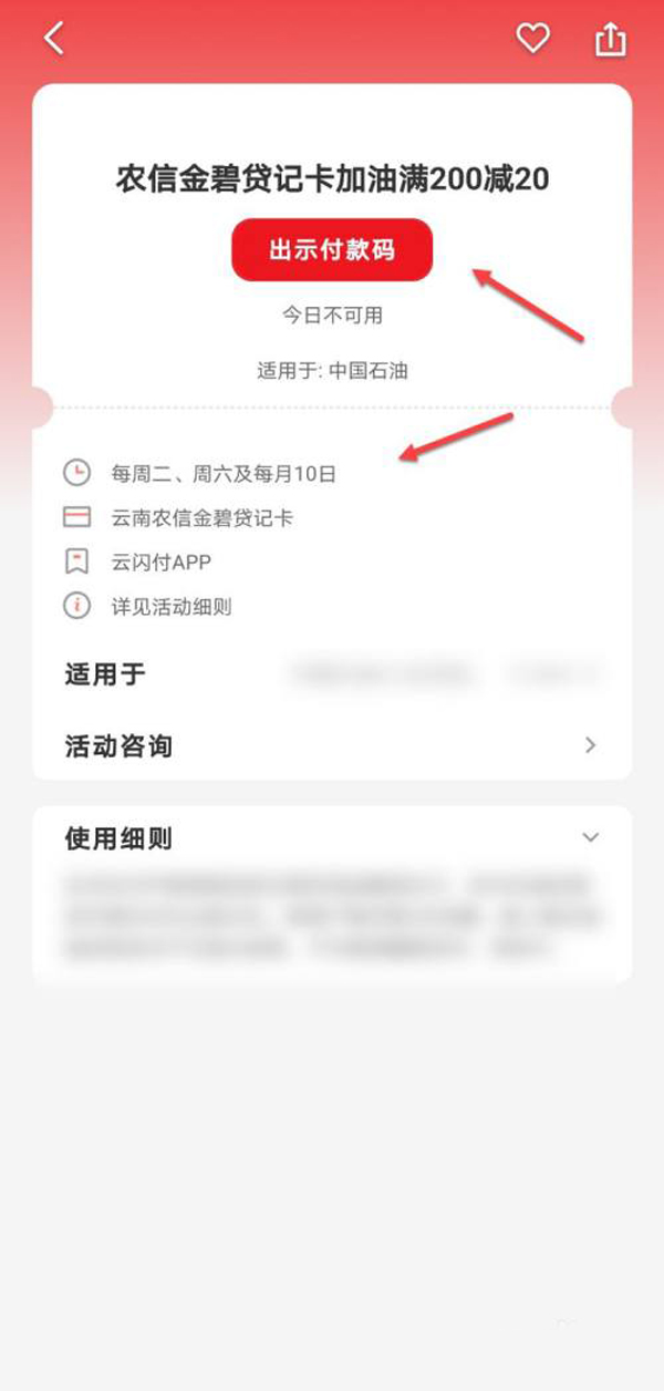 3、在规定的时间内,出示付款码即可直接使用加油优惠。