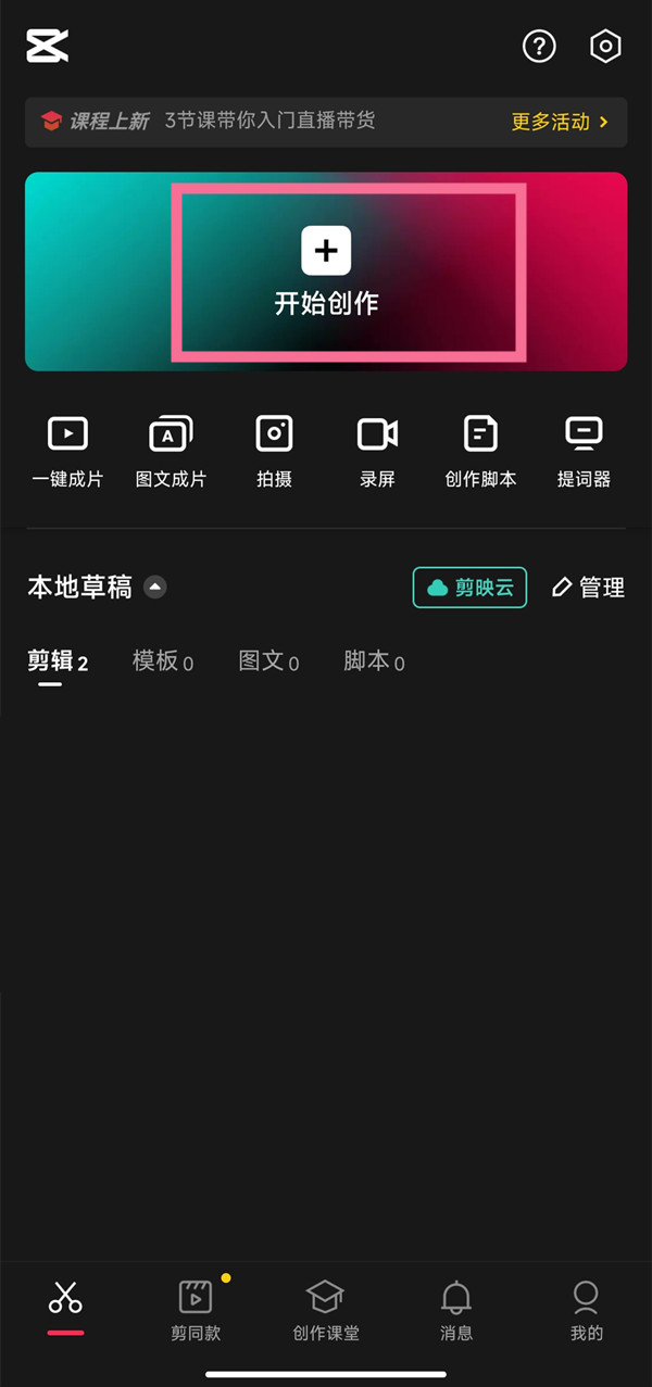 1、打开剪映app,点击最上方的【开始创作】。