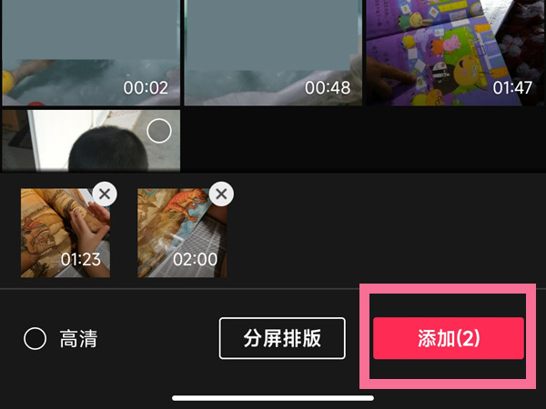 2、选择自己想要合成的两个视频,点击【添加】。