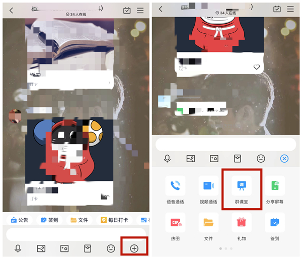 2、进入群聊天界面,点击右下角的【+】号,找到【群课堂】进去。