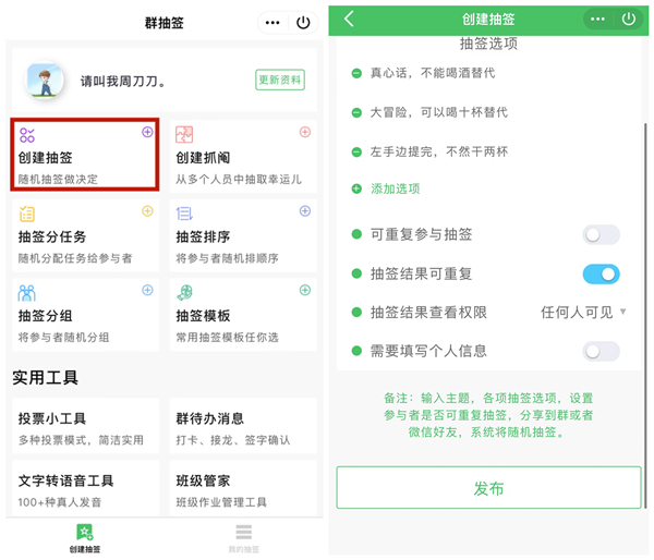 2、进入抽签小工具并【创建抽签】,完善抽签选项。