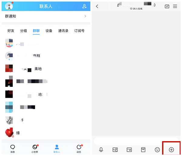 1、我们首先打开QQ群聊天页面,点击右下角【+】图标。