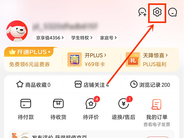 1、打开京东APP,在我的页面点击右上角设置图标。