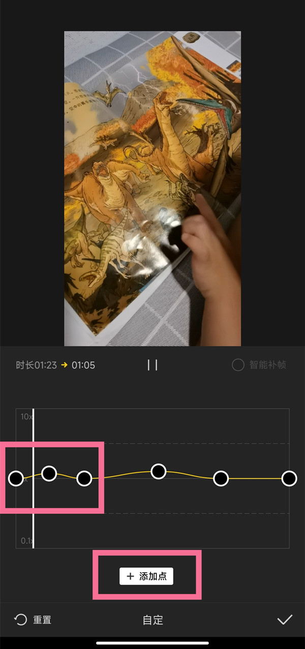 3、进入编辑页面后,点击【添加点】选择变速片段,拖动片段之间的曲线至变速倍率即可。