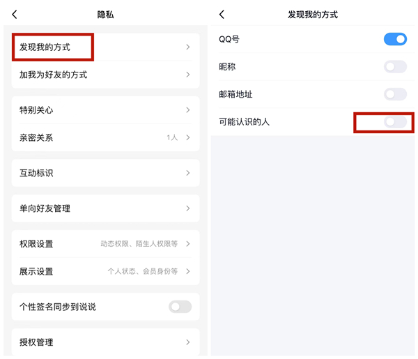 3、在隐私设置中点击【发现我的方式】,在发现我的方式中页面关闭【可能认识的人】右侧按钮即可。