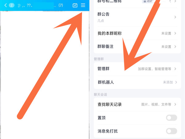 1、打开QQ群聊,点击右上角三横,再点击管理群。
