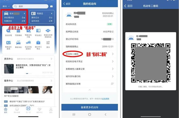 车主用户打开“交管12123”APP,点击首页左上角“机动车”→选择待备案的机动车,生成“机动车二维码”。