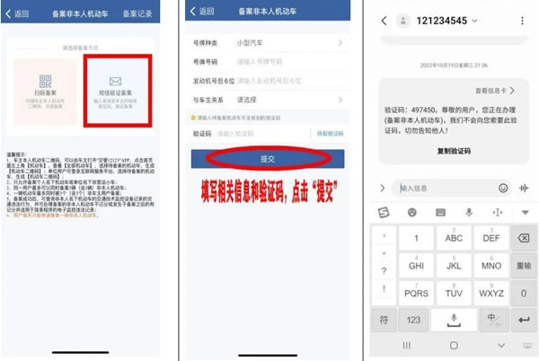 采用“短信验证备案”的,用户输入需要备案的非本人机动车的号牌种类、号牌号码、发动机号后六位等信息后。系统将发送短信验证码至车主手机号码(车主可以是非互联网平台注册用户),申请用户输入车主收到的短信验证码。