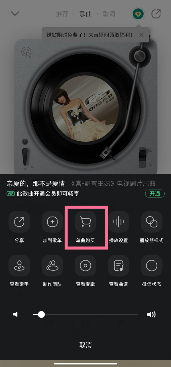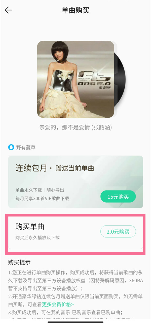 QQ音乐vip歌曲需开通会员后才可以听,而且即使下载了该歌曲,会员到期后也不可以继续听,需要重新开通会员才能听。只有购买了该单曲才可以永久保存。购买单曲方法如下: