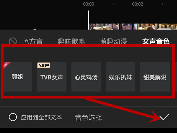 4、进入【文本朗读】界面,选择喜欢的音色点击【√】即可。