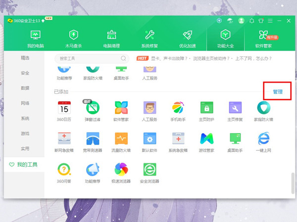 2、在“我的工具栏”点击已添加旁边的【管理】。