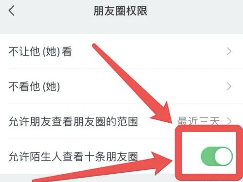 3、进入朋友圈权限界面,开启【允许陌生人查看十条朋友圈】即可。