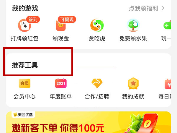 1、打开美团【我的】,点击【推荐工具】。