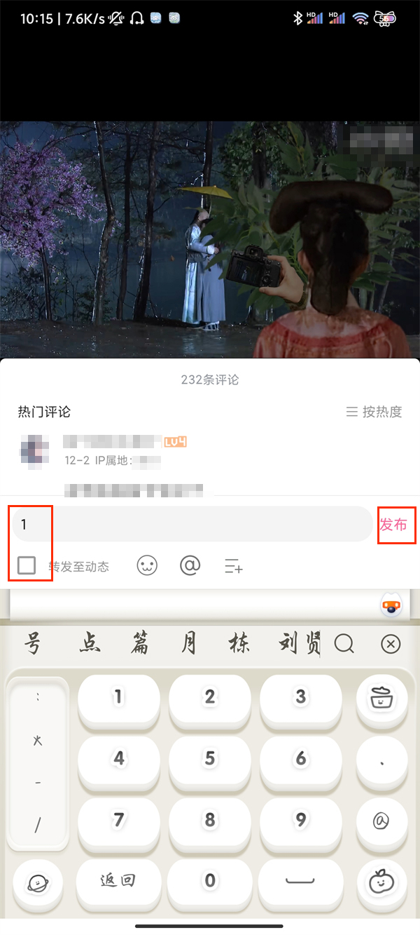 2、点击评论框,输入评论文字,不勾选转发至动态,点击发布即可。