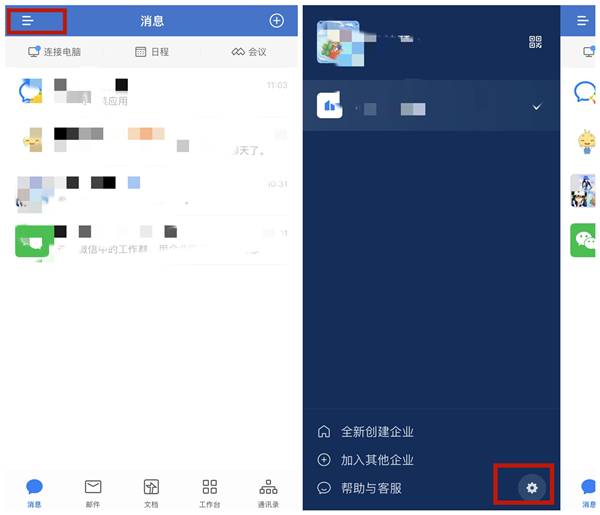 1、打开企业微信消息界面页面,点击左上角三横,点击【设置】。