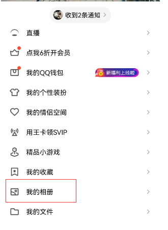 1、首先我们需要登录手机QQ,然后点击左上角的个人头像,在左侧栏目中找到相册。