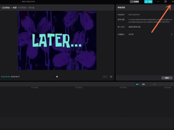 2、选择素材,再点击右上角关闭的图标即可自动保存到草稿,其中,下图显示的文件位置就是草稿在剪映电脑上保存的位置。
