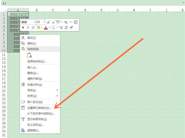 1、在表格中选中日期,单击鼠标右键点击设置单元格格式。