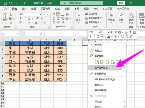 2、在表格中选择一个粘贴的位置,单击右键选中选择性粘贴选项。