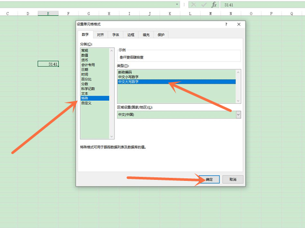 2、点击特殊,选择中文大写数字,再点击确定即可。
