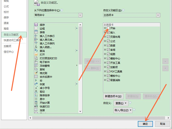 3、再点击自定义功能区,勾选开始,点击确定即可。