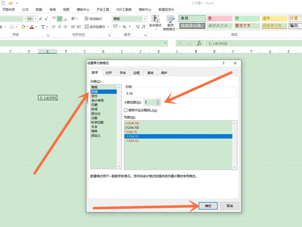 2、点击数值,将小数点位数设置成2,再点击确定即可。