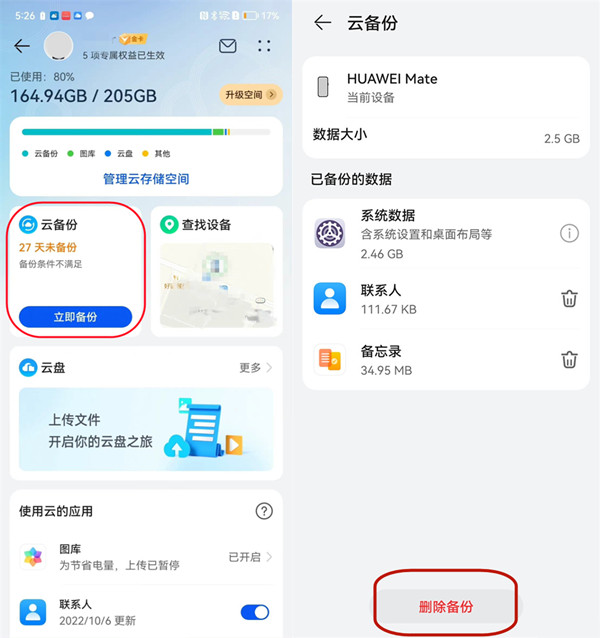 3、点击云备份,选择需要删除的备份,点击【删除备份】即可。