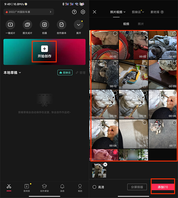 1、打开剪映,点击开始创作,选择需要导入的视频,点击添加。