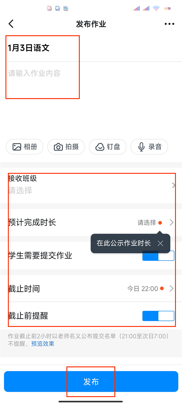 3、输入作业内容,点击发布即可。