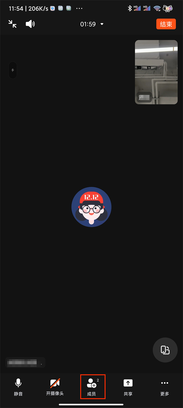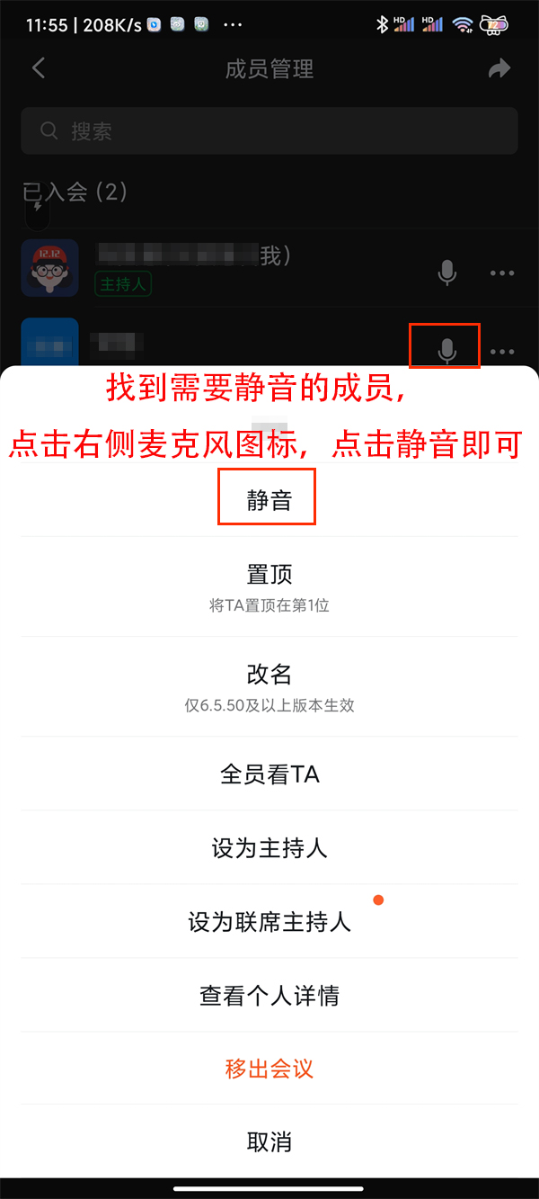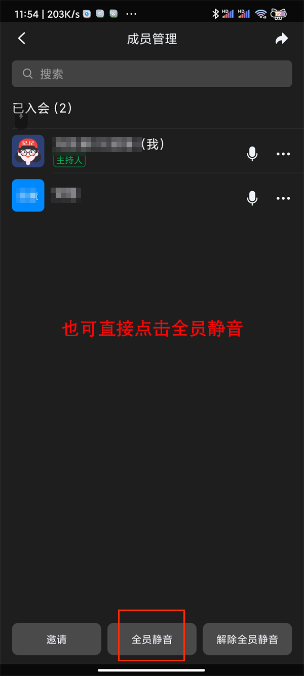 3、找到需要静音的成员,点击右侧麦克风图标,点击静音即可(也可直接点击全员静音)。