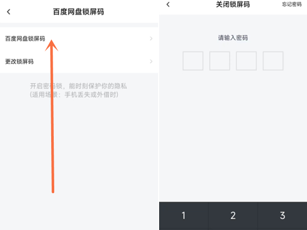 2、点击百度网盘锁屏码,再输入密码即可关闭。