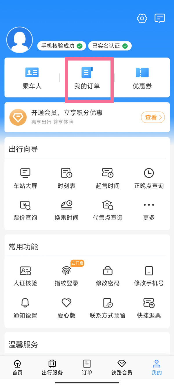 1、打开铁路12306 APP,在“我的”页面点击【我的订单】。