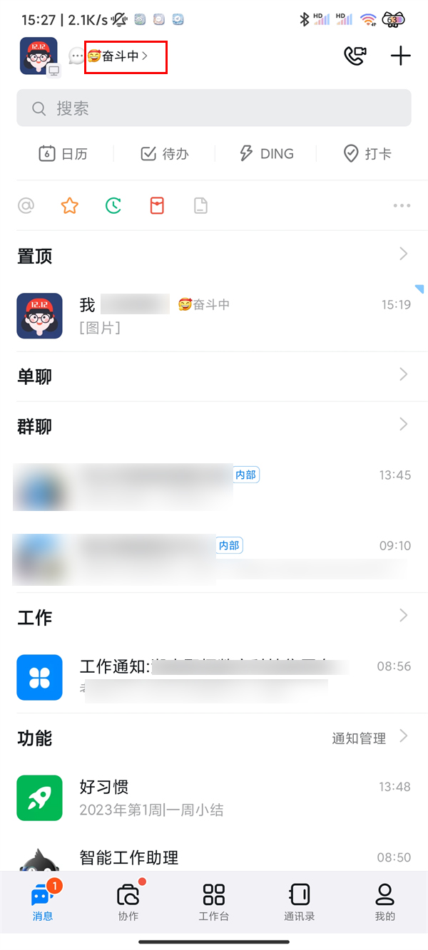 1、打开手机钉钉,在消息页面点击左上角我的状态。