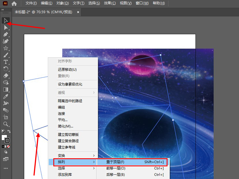 1、点击选择工具并选中图形,单击鼠标右键,点击排列,点击置于顶层。
