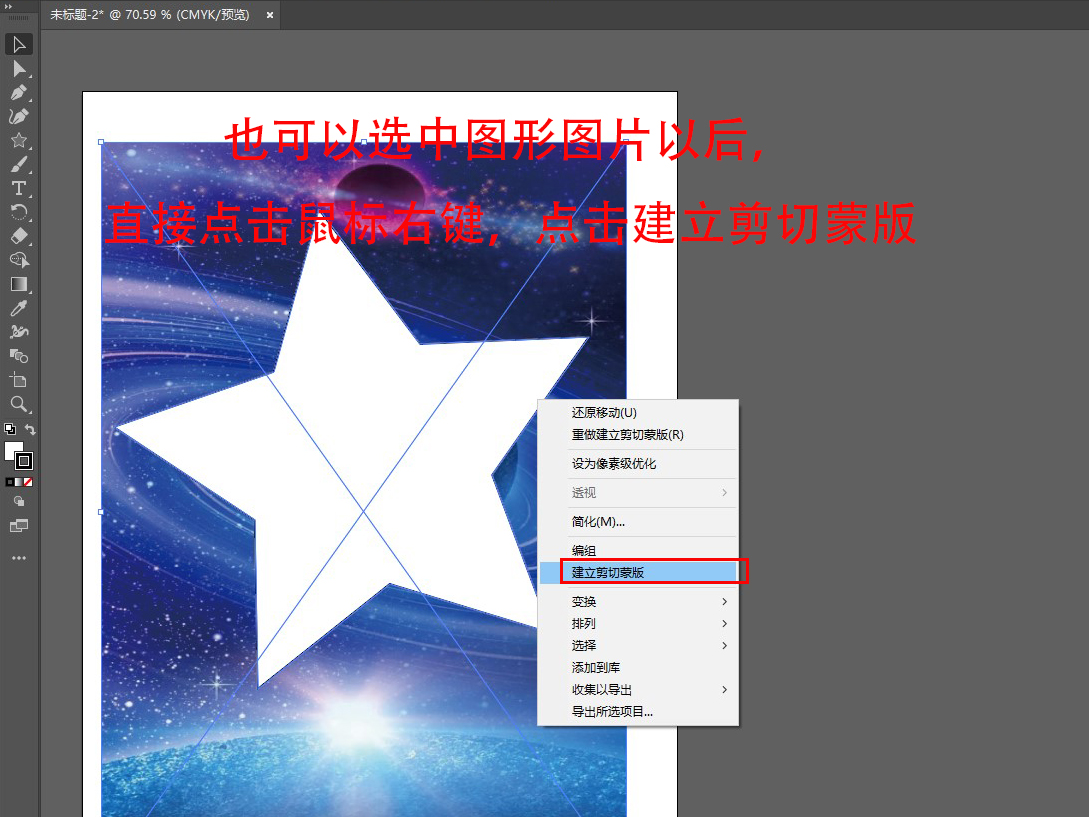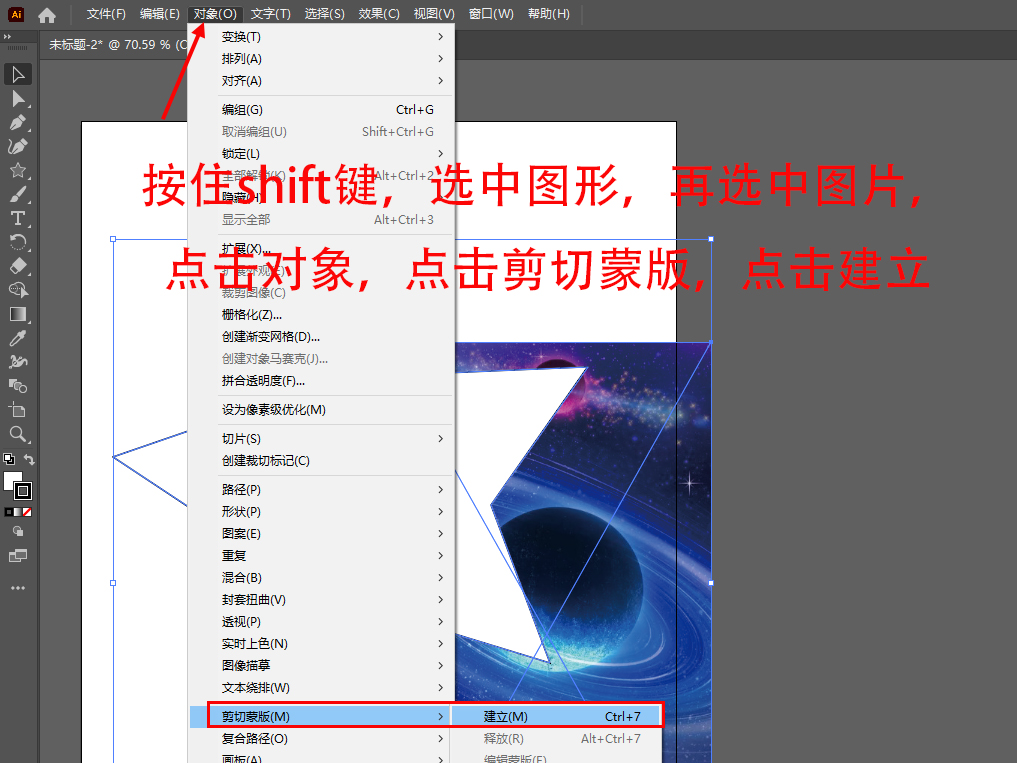2、按住shift键,选中图形,再选中图片,点击对象,点击剪切蒙版,点击建立(也可以选中图形图片以后,直接点击鼠标右键,点击建立剪切蒙版)。