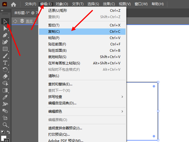 2、点击选择工具并选中矩形,点击编辑,点击复制。
