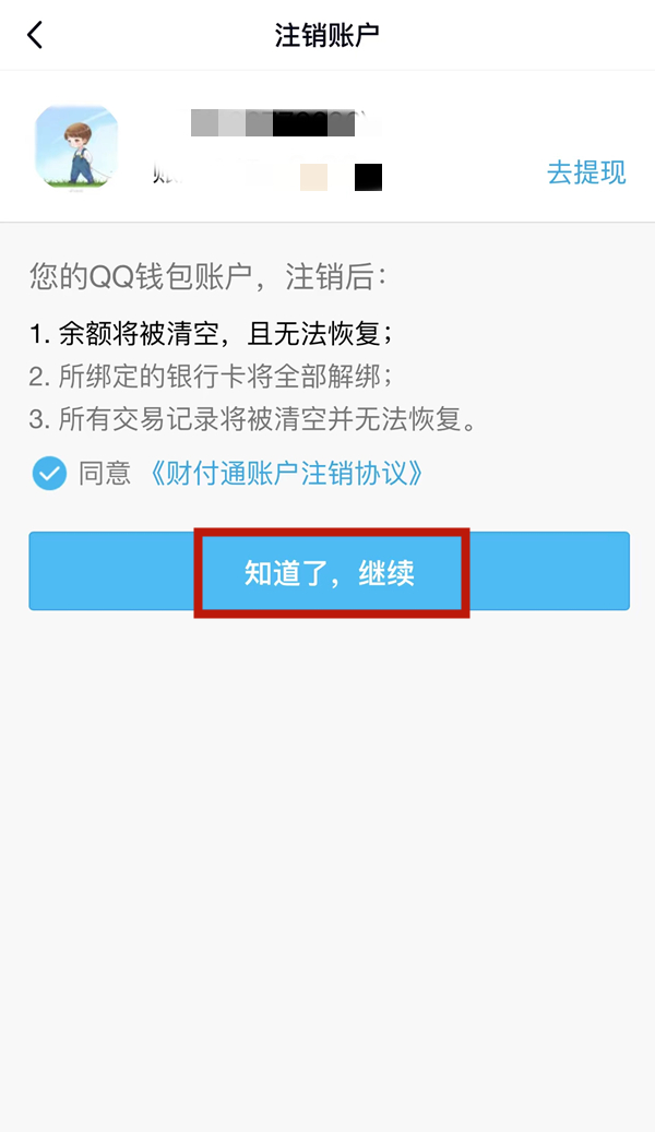 6、在注销账户页面,勾选同意协议,点击【知道了,继续】。