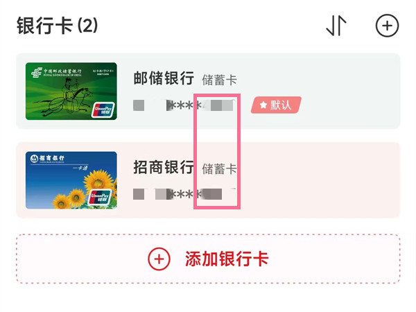 2、在银行卡选项下即可看到卡的后四位。