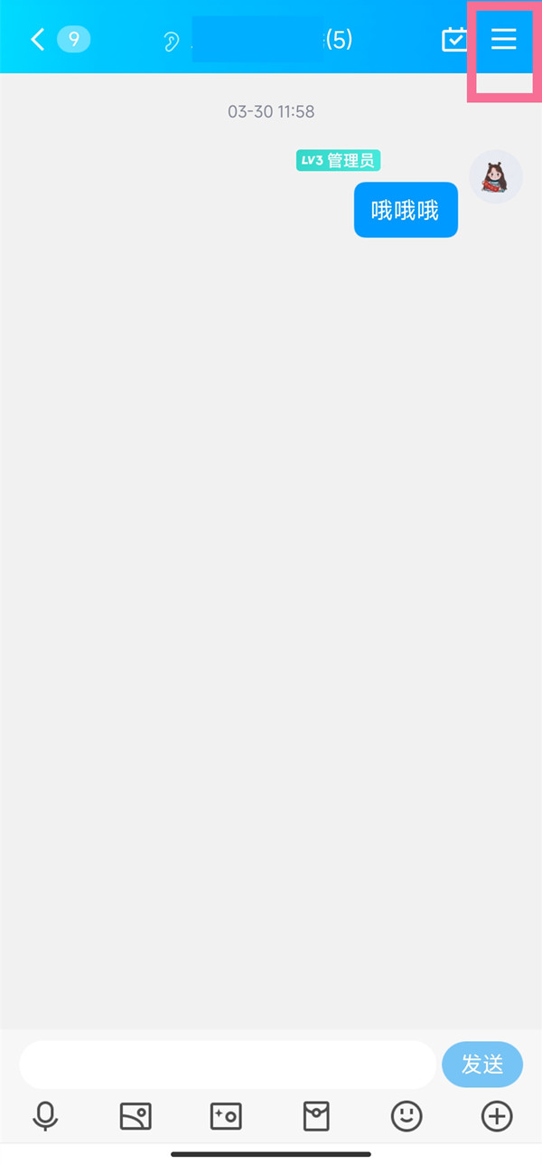 1、打开手机QQ,进入群聊天界面后点击右上角三横进入群聊设置。