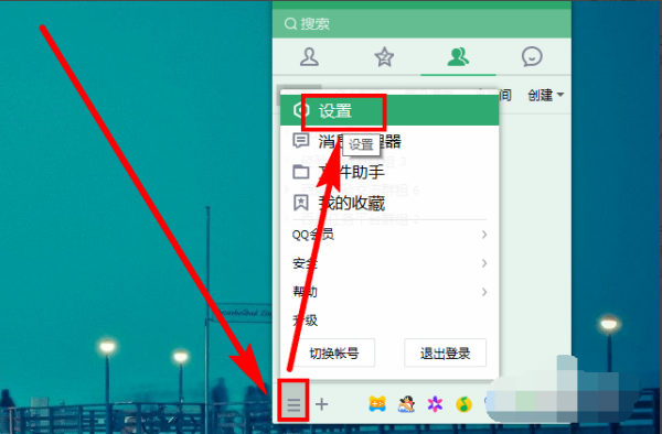 1、打开QQ主面板,点击菜单,点击设置。