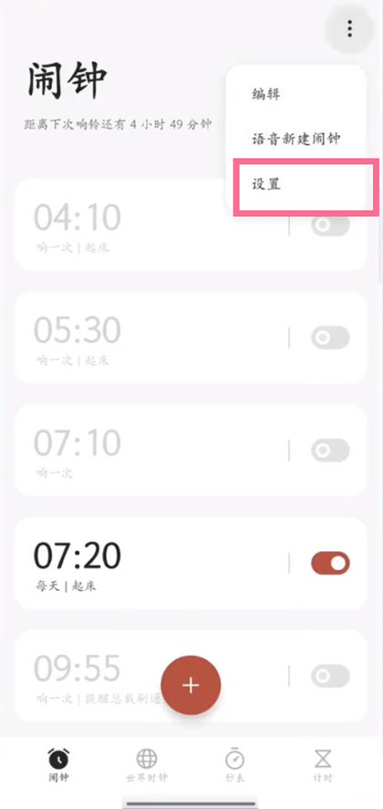 1、打开闹钟,点击右上角三点,选择【设置】。