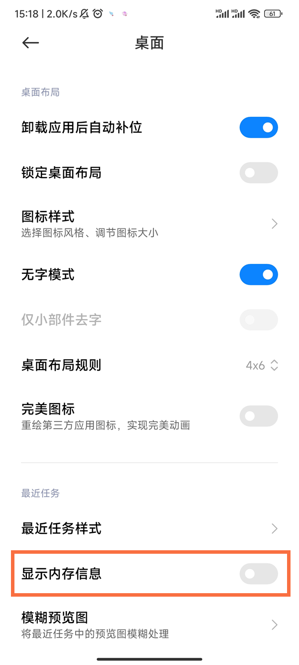 3、返回到桌面,从下往上滑按住屏幕进入任务管理,运行内存显示在屏幕右上角。