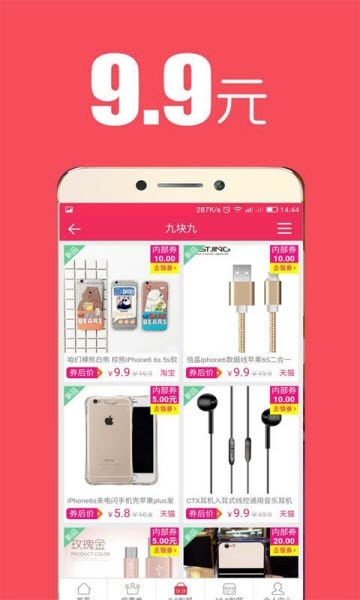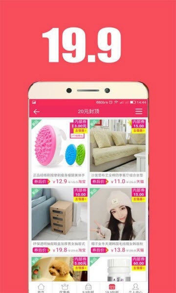 b、实现优惠卷打折购物,全场9.9,19.9等,还包邮;