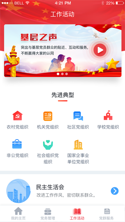 宝塔党建app是一款从建设基层党建为秒的APP平台,在这里通过分享资源提升效率,让基层党建工作更容易推广开来,各个社区和地区的党建工作通过互联网结合起来,让党建工作的执行效率更高,推广力度更佳!