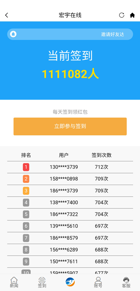 a、可以查看到每日的签到好友以及签到的次数的排名;