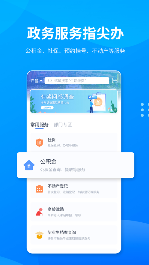 2.“i许昌”平台是一个为许昌市老百姓、企业提供“一站式”政务、民生服务的移动端平台,致力于运用互联网、大数据、人工智能等先进的技术手段,让许昌人民通过一个APP就能通办理许昌事,真正实现“数据多跑路,百姓少跑腿”的目标。