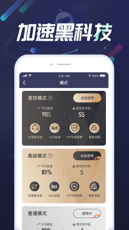 3.黑科技加速效果,为您带来竞技模式体验,通过流畅加速节点享受高级模式以及普通模式等不同的加速方式,获得流畅效果。